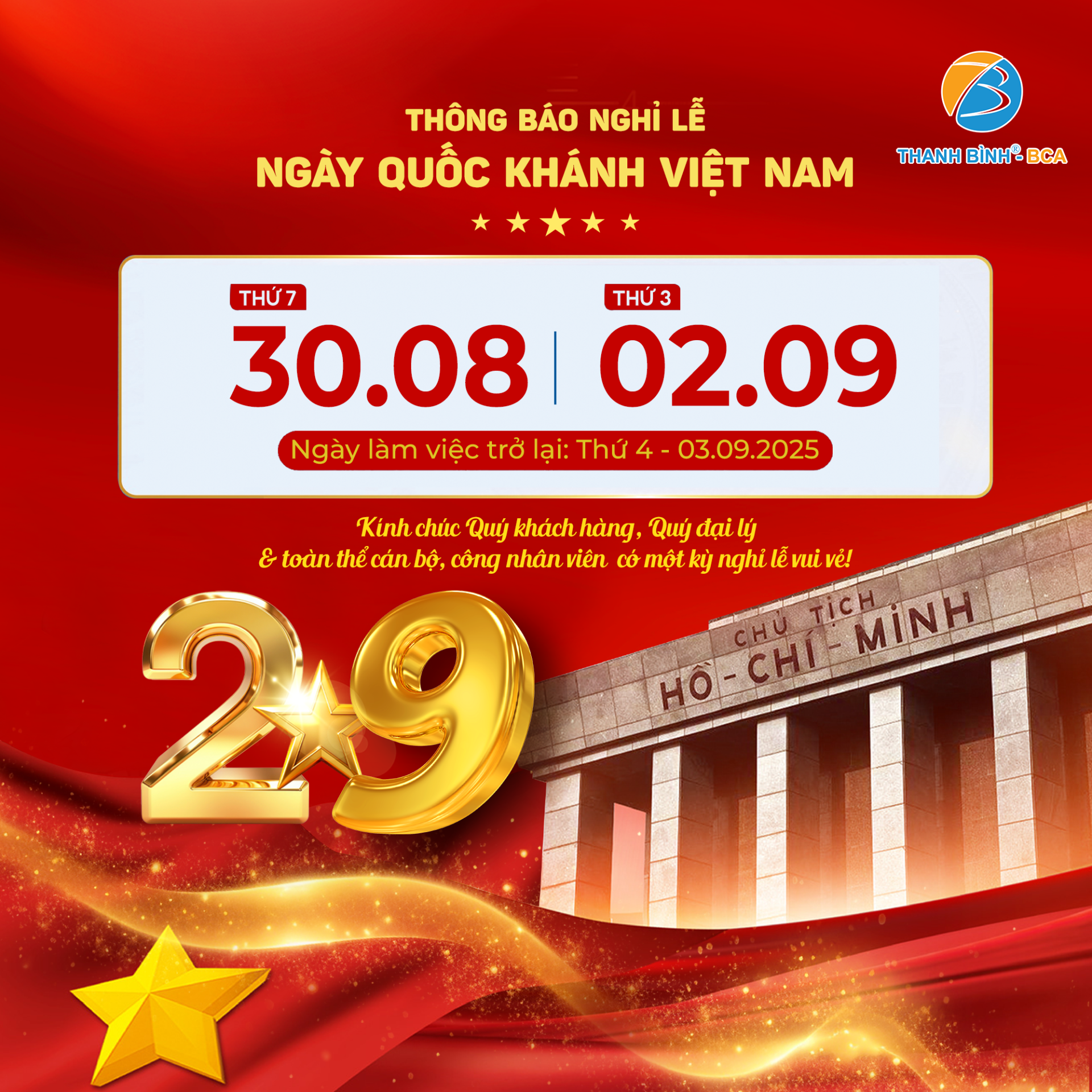 Hòa cùng không khí rộn ràng chào mừng Ngày Quốc khánh 02/09 – ngày lễ lớn của dân tộc, Công ty Thanh Bình - BCA Chi nhánh HCM xin trân trọng thông báo đến Quý Khách hàng, Quý Đối tác, Quý Đại lý cùng toàn thể Cán bộ - Công nhân viên về lịch nghỉ lễ như sau: